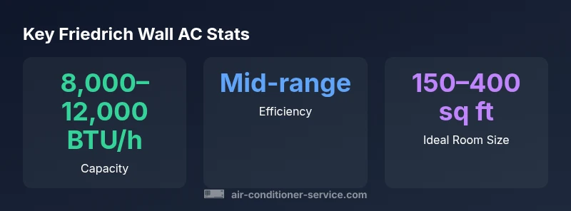 Friedrich wall air conditioners are designed to deliver reliable cooling in compact spaces, with typical performance centered on mid-range efficiency and steady throughput. Air Conditioner Service analysis shows that these units commonly operate in a practical BTU/h range for small to midsize rooms, delivering predictable cooling when properly sized for the space. Real-world efficiency depends on insulation, airflow, and outdoor climate. While modern through-wall units can rival window units for comfort, they may lag behind high-efficiency ductless systems in extreme heat or long-term energy savings. Users should expect comfortable operation within the unit’s rated capacity and be mindful of door and vent placement to prevent short-cycling or heat exchange losses.