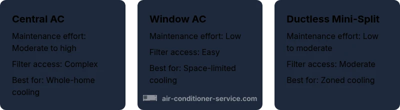 Window units typically offer the lowest maintenance burden for simple cooling needs; central air provides full-home comfort with higher upkeep; ductless mini-splits balance efficiency and upkeep.