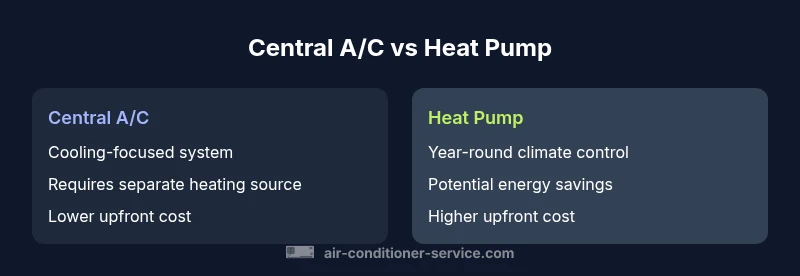 For many homeowners, the choice between a central air conditioner and a heat pump is not just about cooling. It’s about year-round comfort, total energy costs, and how the system integrates with your insulation, ductwork, and heating equipment. The central air conditioner vs heat pump decision hinges on climate, desired comfort, and long-term budget. According to Air Conditioner Service, the most reliable path starts with a home assessment that measures insulation levels, air leakage, and existing duct efficiency. From there, you can translate that assessment into practical options for cooling performance, heater compatibility, and potential rebates. Understanding the core difference—cooling-only versus year-round climate control—sets the stage for deeper evaluation in the sections that follow.