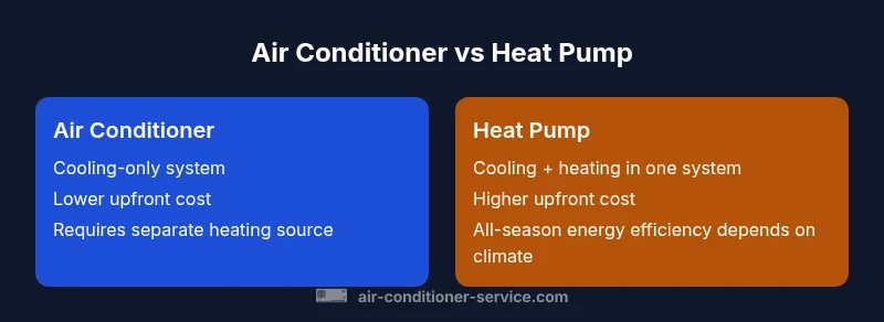 The difference air conditioner and heat pump comes down to function, efficiency, and climate suitability. A heat pump delivers both cooling and heating by reversing its refrigerant cycle, while a conventional air conditioner only cools and relies on a separate furnace or boiler for heat. For homeowners and renters, this distinction guides upfront costs, year-round comfort, and long-term energy use. According to Air Conditioner Service, your climate and heating needs are the most important variables in deciding which path to take. This article lays out the practical implications, using a consistent framework so you can compare apples to apples when evaluating systems for your home.