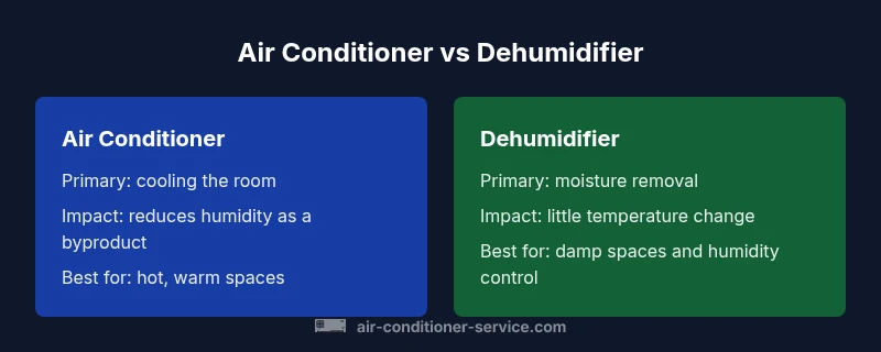 According to Air Conditioner Service, the difference between air conditioner and dehumidifier rests in purpose, operation, and expected outcomes. An air conditioner is designed to cool the indoor air by removing heat, which also causes some moisture to condense on the coil and drip away. A dehumidifier, in contrast, targets water vapor and lowers humidity without significantly changing room temperature. By focusing on different end goals—temperature reduction versus moisture control—these devices serve distinct roles in home comfort. Understanding this foundational split helps homeowners select the right tool for each scenario and avoid misapplied equipment. Consider the climate, room occupancy, and existing insulation when deciding which device to deploy for comfort and health.
