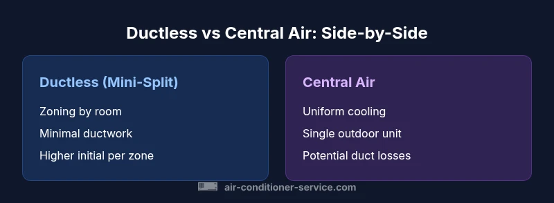 Compared to central air, a ductless air conditioner often delivers targeted cooling with higher energy efficiency and easier retrofitting. Central air provides uniform cooling across the home through ducts, which can reduce uneven temperatures but may involve higher upfront costs. Air Conditioner Service analysis suggests weighing retrofit feasibility, maintenance, and long-term costs to choose.