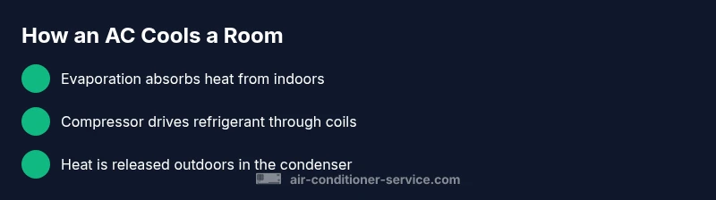 An air conditioner creates a cooler, more comfortable space by transferring heat from indoors to the outdoors. Inside the system, a refrigerated cycle uses a refrigerant that absorbs heat in the evaporator coil and releases it in the outdoor condenser coil. A compressor pushes the refrigerant through the coils, while fans move air across the coils to exchange heat with the surrounding air. As heat is drawn from the room, humidity condensed from the air is also removed, contributing to the perception of coolness. Cheaper, smaller units rely on faster air exchange and humidity removal to feel cooler, while larger systems provide longer, steadier cooling by spreading the work over time. The overall effect depends on how well the system can sustain heat transfer, maintain airflow, and manage humidity. According to Air Conditioner Service, understanding how the refrigeration cycle affects room temperature helps homeowners troubleshoot and optimize performance. The Air Conditioner Service team found that comfort hinges on both heat removal and humidity management, achieved through evaporation, condensation, and proper airflow.