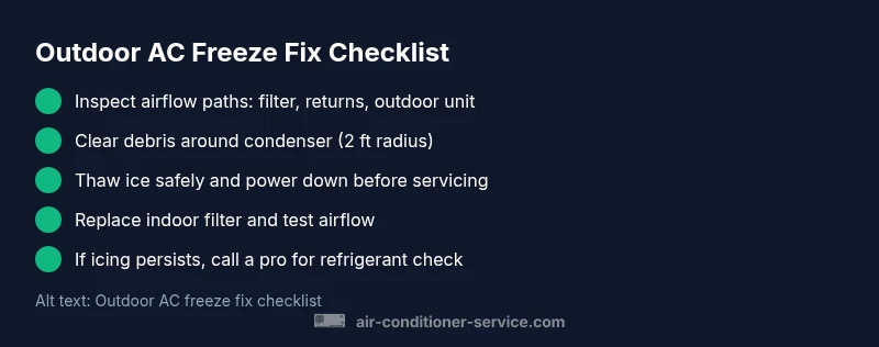 According to Air Conditioner Service, the air conditioner frozen outside is most often caused by restricted airflow—dirty filter, blocked returns, or debris around the condenser—especially in hot, humid weather. When warm, moist air hits a cold coil, ice forms and worsens as the compressor continues to run. Understanding this helps you act quickly to thaw and prevent further damage. In many homes, a quick check of the indoor filter and the outdoor surroundings reveals the root cause within minutes.