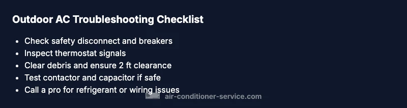 If your air conditioner not running outside, the outdoor unit that houses the condenser is often the culprit. According to Air Conditioner Service, most outdoor-unit failures begin with power or control issues rather than mechanical faults. The outdoor unit only runs when the indoor thermostat calls for cooling, so a mismatch between signals or a safety trip can prevent it from starting. Start with the basics: check that the outdoor disconnect switch is ON and that the circuit breaker for the unit has not tripped. A blown fuse in the disconnect or a tripped breaker is a common reason the unit stays idle. Do a quick visual inspection of the condenser and fan: are the fins clear, and can the fan blade spin freely by hand (with power safely disconnected)? If the unit feels unusually hot, this can indicate an overload condition. Finally, remember that high outdoor temperatures or blocked airflow can trigger safety protections that pause operation. These early checks set the stage for more targeted diagnoses without sacrificing safety.