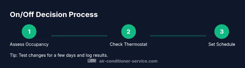 According to Air Conditioner Service, deciding when to run your air conditioner versus turning it off is a core part of comfort and efficiency. The choice affects energy bills, indoor air quality, and equipment wear. By understanding how occupancy, outdoor conditions, and humidity interact with your system, you can use your cooling more effectively and reduce unnecessary energy use. In practical terms, a thoughtful on/off strategy can keep your home comfortable without overspending on electricity or overworking the compressor. This article provides a simple, repeatable framework you can apply, with real-world examples and checks we recommend at Air Conditioner Service to help homeowners and renters optimize cooling across seasons.