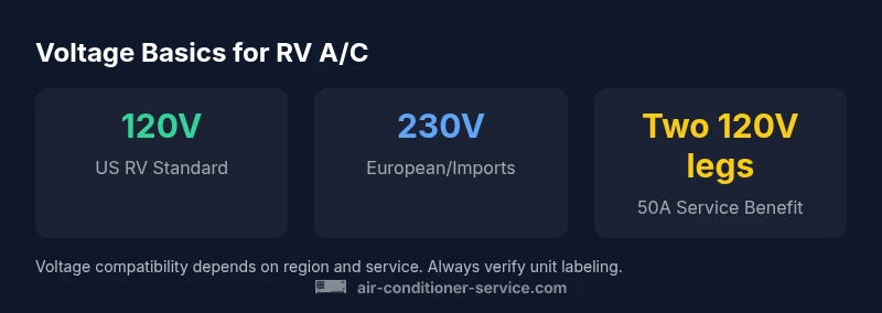 When we talk about voltage for RV air conditioners, the question are rv air conditioners 110 or 220 often arises. In practice, most North American RVs rely on 120V AC shore power, which is historically referred to as 110V in older manuals. This voltage level is sufficient for typical rooftop air conditioners when the camp setup provides adequate amperage and stable power. Air Conditioner Service emphasizes that voltage stability matters just as much as the amperage available. A drop in voltage can reduce cooling performance and potentially shorten compressor life. Recognizing this, owners should verify that their shore power source maintains a steady 120V under load and consider a dedicated circuit or surge protection when operating high BTU units. If you frequently travel internationally, you may encounter 230V mains in other markets, which requires the correct unit rating or a converter.