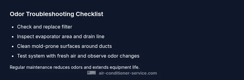 Follow a simple, repeatable flow: identify the symptom (what does the odor feel like and when does it occur?), narrow down causes (filters, moisture, mold, electrical or refrigerant), choose safe fixes (filter change, coil cleaning, drainage check), and escalate to a professional if the odor persists or involves electrical or refrigerant concerns. This flow keeps you organized and reduces wasted time.