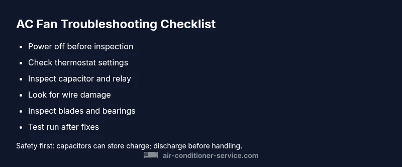 Most often, a not-working AC fan is caused by a failed start capacitor or a tripped circuit, followed by simple fixes you can perform safely. Start by turning off power at the breaker, then inspect obvious issues like a loose wire, a dirty air filter, or a blocked condenser. If the fan still won't run, professional help is recommended.