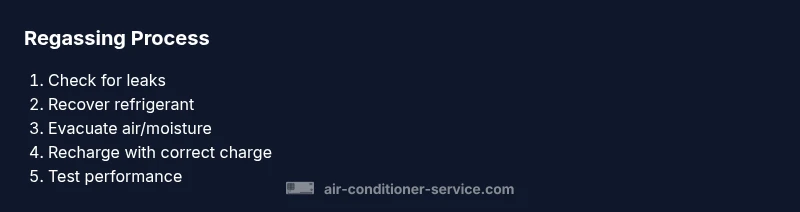 Regassing, in the context of air conditioning, is the process of restoring the refrigerant level in the system after a leak or loss. It differs from a simple recharge: regassing includes confirming the system is leak-tight, evacuating moisture, and charging with the correct type and amount of refrigerant as specified by the manufacturer. When you ask how to tell when air con needs regassing, you’re looking for a mix of pressure readings, cooling performance, and physical signs such as oil around connections or a drop in suction pressure. In residential units, most regassing work is done by licensed technicians who also repair leaks to prevent future losses. The goal is not just to fill a bottle, but to ensure the system operates at the manufacturer’s intended pressures and temperatures. As you explore this topic, keep in mind that refrigerant handling is regulated and improper charging can damage components or harm you. Air Conditioner Service emphasizes safety, proper procedure, and adherence to local regulations.