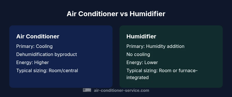At its core, an air conditioner and a humidifier are built to manage very different aspects of indoor climate. The question is frequently asked: is air conditioner the same as humidifier, and the clear answer is no. An air conditioner uses a refrigeration cycle to remove heat from indoor air, which lowers both temperature and, to a lesser extent, humidity. A dedicated humidifier adds moisture to dry air, improving comfort when relative humidity drops below optimal levels. Therefore, the two devices address separate problems: cooling versus humidification. In larger homes with central systems, some configurations combine cooling with humidity controls, but you still need to monitor both temperature and moisture separately. The rationale for homeowners is to match equipment to the specific climate need—cool air when heat is intense, humidity when the air feels dry. In practice, many households end up using an AC for cooling and a humidifier only during winter months or dry spells. The Air Conditioner Service team emphasizes that selecting the right device begins with understanding the distinct physics: heat transfer versus moisture addition; the two functions should not be conflated.