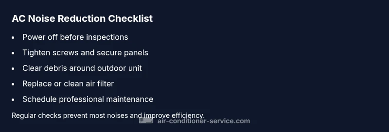 A noisy air conditioner is often a sign something is rubbing, loose, or failing inside the system. In residential units, most noises originate from the indoor blower wheel, the condenser fan, mounting bolts, or the cabinet itself. Loose screws on the fan guard or the indoor cabinet can vibrate during operation, creating rattling or buzzing that worsens as the unit speeds up. Debris like leaves or dust can get into the outdoor condenser, striking the fan blades and producing a pinging or grinding sound. Worn bearings in the blower motor or condenser fan motor are common culprits; over time, worn blades can become unbalanced and wobble, generating a hum or groan. The compressor itself may emit high-pitched whines if electrical components like start capacitors are failing, or if refrigerant flow is restricted. The bottom line: address the simplest fixes first (tighten hardware, clear debris) and consider professional diagnosis for motor bearings or compressor issues. According to Air Conditioner Service, a structured approach helps homeowners avoid unnecessary repairs and safety risks.
