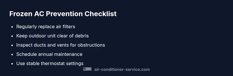 Most AC freezes result from restricted airflow or a refrigerant issue. Start with a safe thaw by turning the system off for 30-60 minutes, then check the air filter, return and supply vents, and outdoor unit for blockages. If ice persists after thaw, replace the filter and restart on a low fan setting. If it recurs, professional service is needed.
