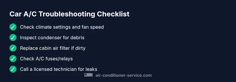 According to Air Conditioner Service, many drivers face a car A/C that seems to blow only warm air. If you're wondering what to do if air conditioner in car is not cold, start with simple, safe checks that cover the most common causes. In most vehicles, the cooling problem comes from low refrigerant, a blocked condenser, or an electrical fault that prevents the compressor from turning on. Before you dive into expensive repairs, verify basic settings, listen for the compressor engagement, and inspect airflow pathways. The Air Conditioner Service team found that most not-cooling issues stem from leaks, debris, or airflow restrictions. This approach balances quick wins with thorough inspection. If you identify refrigerant leaks, unusual noises, or persistent failure to engage, stop and seek professional help immediately.