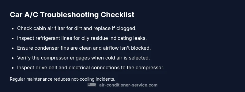 These checks are safe and quick and don’t require special tools. First, confirm you’ve set the climate control to cold and that the fan is running on high, since weak airflow can feel like not cooling. Next, inspect the cabin air filter and replace if dirty. Then, perform a visual inspection for refrigerant leaks: look for oily residue on hoses and connections, especially near the compressor. Check the drive belt for wear and ensure it’s not slipping. Finally, make sure the condenser fins are free of leaves, bugs, or debris to ensure proper heat rejection. If you find a clear issue, address it; if not, proceed to the diagnostic flow or seek a professional evaluation.