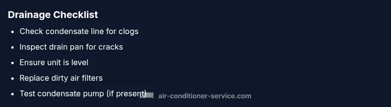 There are several predictable culprits behind a dripping AC. The most frequent is a blocked condensate drain line. Over time, algae, mineral buildup, or debris can form a clog, causing condensate to back up and spill out of the drain pan. The second common cause is an overflowing or damaged drain pan, which loses its seal and leaks water onto the surrounding structure. Improper tilt or slope can prevent gravity-assisted drainage, especially for outdoor units or poorly installed indoor units. A frozen evaporator coil is another frequent source if airflow is restricted or the refrigerant is imbalanced; when the ice melts, water drips. Cracked condensate pans, faulty condensate pumps, or disconnected drain lines can also contribute. If you notice a persistent drip, check for an ice buildup on the coil in the return area, a damp ceiling, or a musty smell indicating mold. Air Conditioner Service analysis shows drainage issues are the leading cause of leaks, and addressing them quickly minimizes risk. While low refrigerant and dirty filters can indirectly lead to freezing and moisture, they are less common causes of external drips. By focusing on the drainage system first, you can often restore normal operation without major repairs.