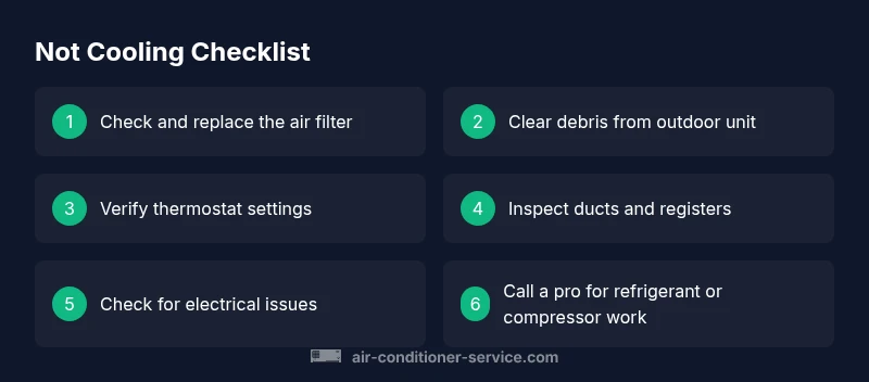 When your air conditioner isn’t cooling, the problem is usually a simple maintenance issue or an airflow block rather than a dramatic mechanical failure. According to Air Conditioner Service, the most common not-cooling issues are often caused by restricted airflow or insufficient refrigerant due to small leaks. This means a homeowner can often resolve the issue with basic checks. Begin with the obvious points: inspect the air filter, ensure the outdoor unit has clear space, and confirm the thermostat is set correctly. If these basics are addressed and cooling is still weak, you’ll pursue deeper checks. A clean, properly functioning system moves air efficiently, and even a small filter clog can dramatically reduce cooling capacity. Air Conditioner Service’s guidance emphasizes starting with quick, low-cost steps before escalating to professional help.