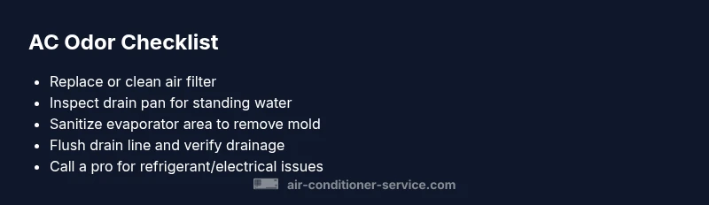 Start with low-risk steps before diving into complex fixes. - Power down the unit at the thermostat and disconnect the outdoor unit if safe to do so. - Check and replace the air filter; a clogged filter reduces airflow and promotes moisture and odors. - Inspect the condensate pan and drain line for standing water, mold, or algae; clear clogs if you can do so safely. - Look for visible signs of mold on evaporator coils or in the duct plenums, and consider a professional cleaning if you see growth. - If the smell is chemical, refrigerant or solvent-like, do not run the system; contact a licensed pro immediately. - After addressing obvious issues, run the fan mode for 10-15 minutes with the vents open to dry and circulate air, then recheck.