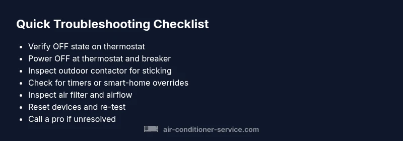 According to Air Conditioner Service, the symptom of an air conditioner that will not turn off is often caused by an electronics signal that fails to tell the system to stop. This can stem from a thermostat that is stuck or misreading, a relay or contactor in the outdoor unit that sticks closed, or a control board that keeps energizing the compressor. In many homes a simple setting or routine is to blame, but electrical faults should never be ignored. The primary goal of this guide is to help homeowners and renters diagnose the most common culprits, implement safe fixes, and prevent recurrence. By understanding the sequence of signals—from thermostat to contactor to compressor—you can quickly identify where the system is getting stuck and take appropriate action.