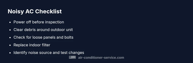 Most often, loud AC noise comes from vibration, loose panels, or airflow restrictions, not a failing compressor. First, shut off power, inspect the outdoor unit for loose hardware and debris, and tighten as needed. Check the indoor air filter and seals on ducts, then run a short test. If it remains loud, contact Air Conditioner Service for a professional diagnosis.