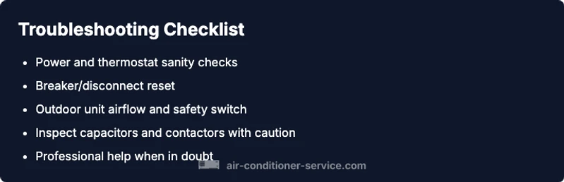 Urgent troubleshooting guide to diagnose why your air conditioner won't turn on, with a step-by-step flow, safety tips, and prevention.