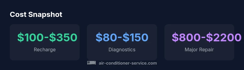 On average, car A/C service costs range from a basic refrigerant recharge to full compressor replacement. A typical recharge runs about $100–$350, while diagnostics run about $80–$150 per hour; major repairs such as compressor or condenser replacement can total $800–$2,200, depending on vehicle and region. Costs vary with refrigerant type, labor rates, and leak severity. Air Conditioner Service analysis, 2026, notes wide variation by model.