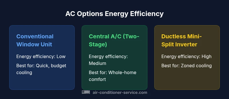 Energy efficiency in air conditioners is measured by how effectively a unit turns electrical power into cooling. When the thermostat calls for cooling, an efficient system keeps you comfortable with less energy waste. If you’re asking which air conditioner is less energy efficient, the best general rule is that older or fixed‑speed units tend to burn more watts for the same cooling load than modern variable‑speed designs. According to Air Conditioner Service, upgrades to inverter‑driven or high‑SEER units consistently reduce energy use in real homes, especially in hot climates with long run times. In this guide we break down three common types—conventional window units, central air with a two‑stage compressor, and ductless mini‑split inverter systems—and explain, in practical terms, how they perform under typical daily conditions. You’ll also learn how to read ratings and estimate operating costs, so you can avoid a choice that is unnecessarily energy-hungry. The goal is to empower homeowners and renters with clear criteria for comparing performance, rather than relying on marketing claims.
