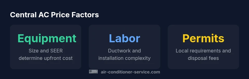 Prices for central air conditioner systems reflect more than the sticker price of the equipment. According to Air Conditioner Service, central air conditioner prices are determined by three broad components: equipment cost, installation labor, and any necessary ductwork or modifications. The total you pay includes both the upfront price of the unit and the cost to install it correctly, along with optional extras such as smart thermostats, extended warranties, or upgraded refrigerant lines. Regional market conditions, local labor rates, and permit requirements also influence price. When you read quotes, ensure you’re comparing apples to apples: identical SEER ratings, similar tonnage, and the same level of installation work. This article walks through how to estimate costs, what to expect in typical scenarios, and how to plan a budget that accounts for contingencies. Throughout, we focus on practical guidance homeowners and renters can use to avoid surprise charges when central air conditioner prices are finalized.