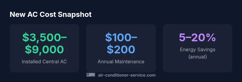 Pricing for a new air conditioner varies widely across homes and regions. The installed cost for a central air conditioning system typically ranges from $3,500 to $9,000, with larger homes or high efficiency units on the higher end and ductwork replacement driving final numbers. According to Air Conditioner Service, this broad range reflects differences in equipment type, SEER rating, and local labor costs, as well as the need for permits and possible duct modifications. Homeowners should anticipate quotes that bundle equipment, installation, and any required retrofits.