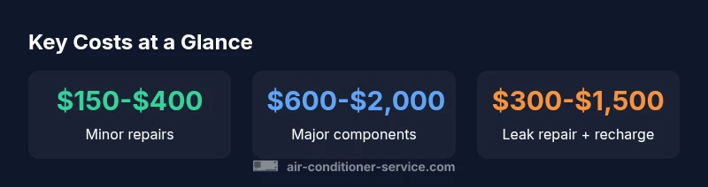 Repair costs are not a single number; they break down into several components that customers should review before authorizing work. The diagnostic/inspection fee establishes the baseline price for finding the problem. Labor is typically charged by the hour and can vary widely by region and demand. Parts costs depend on the exact component—capacitors, contactors, motors, fans, or compressors—and whether OEM or aftermarket parts are used. Travel or after-hours charges are common in some markets. In practical terms, a small electrical fault on a compact unit might only require a few hundred dollars, while a refrigerant leak could require both leak repair and a refrigerant recharge, pushing costs higher. Understanding this breakdown helps homeowners compare quotes and avoid hidden fees. Air Conditioner Service analysis shows diagnostic fees and labor often dominate early price estimates, with parts driving the variance once the exact fault is identified.