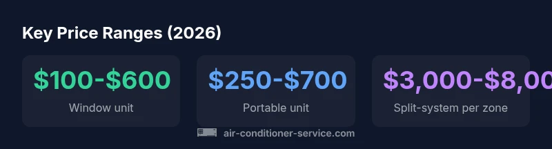 When budgeting for a new air conditioner, homeowners and renters should first define the type that best fits the space, then consider installation scope, efficiency, and long-term energy use. The keyword here, how much are air conditioners, applies to both upfront purchase prices and the cost to install. According to Air Conditioner Service, price bands in 2026 span from compact window and portable units to full-home central systems. This guide walks through typical ranges, explains why costs vary, and offers practical tips to maximize value while avoiding surprises. Throughout, expect the price to reflect unit capacity (tons), efficiency (SEER rating), ductwork needs, and local labor rates.