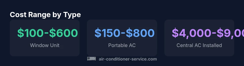 Prices for air conditioners are driven by unit type, BTU capacity, and installation needs. Prices vary by region and retailer, but a useful starting point helps homeowners plan. According to Air Conditioner Service, for many homes the smallest upfront cost comes from window-mounted units, which typically cost between a few hundred dollars to around six hundred dollars for the unit alone. If you include installation, the price can rise, especially if you need to retrofit mounting points or adjust electrical circuits. Portable air conditioners tend to sit in a similar price band, often between a few hundred and about a thousand dollars when you factor in basic installation or setup. Central air systems, by contrast, carry a much higher upfront price: the equipment itself plus professional installation commonly lands in the several-thousand-dollar range, depending on house size and ductwork. Ductless mini-splits, which offer zoned cooling, fall between these extremes, with per-zone costs typically in the mid-to-high thousands when labor and refrigerant lines are included. The Air Conditioner Service team found that the exact cost hinges on efficiency ratings (SEER), cooling capacity, and whether existing ducts can be reused. In short, pricing is highly variable, and a precise quote requires a professional assessment of your space.